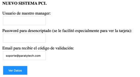 Una vez dentro del enlace, os pedirá que introduzcáis el usuario del manager de Paraty que tenga permisos al hotel y una contraseña que se facilitó especialmente para desencriptar tarjetas. El correo que aparece por defecto es el que está configurado para recibir los emails de reserva del hotel, por lo tanto asegurase que el correo que aparece es el suyo o tiene acceso, sino modifícalo, ya que ahí llegará la clave necesaria acceder a los datos de tarjeta. En caso de que no disponga de esta información, contacte con su Account Manager y le proporcionará las claves necesarias.