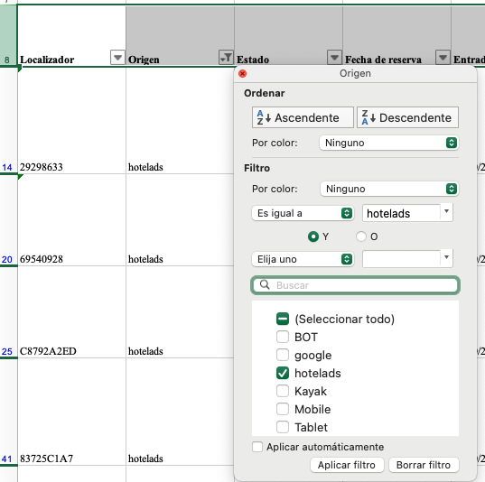 En este excel aparecerá el listado de reservas para conciliar, sólo que será necesario aplicar un filtro en la casilla Origen para filtrar por el origen correspondiente.